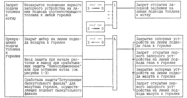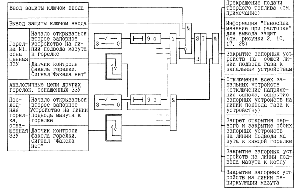 Примечание - Для котлов с ПЗК: «Запрет открытия первого запорного устройства на линии подвода топлива к каждой горелке». Для котлов без ПЗК: «Запрет открытия первого запорного устройства на линии подвода топлива к каждой горелке растопочной группы».