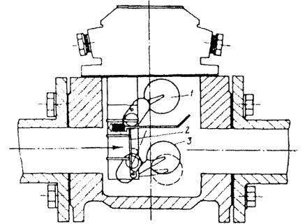 поверхности корпуса блока и внутри коробки зажимов имеются знаки заземления « В один из штуцеров устанавливается резьбовая втулка с комплектом упорных и уплотнительных шайб, служащая для установки монтажного кабеля и закрепления металлорукава. В другой штуцер устанавливается заглушка с упорной и уплотнительной шайбами. Обозначение элементов конструкции блока БКР2 (см. рисунок 9) в основном соответствует обозначениям аналогичных элементов блока БКР1. В отличие от блока БКР1 блок БКР2 имеет два поплавка - верхний 6.1 и нижний 6.2 с постоянными магнитами, управляющими герконами; фиксирующая скоба 6 в блоке БКР2 отсутствует. Кнопка проверки 7 служит для проверки работы поплавков 6.1 и 6.2 и напорной пластины 5. Для безопасности обслуживающего персонала корпус реле соединяется с заземленной крышкой с помощью одного из болтов, крепящих крышку к корпусу реле. Головка этого болта (болт безопасности) окрашена в красный цвет и под него подложена зубчатая или обычная пружинная шайба, что при затягивании болта создает надежный контакт с крышкой. Проверка работы струйного реле от действия напорной пластины, а также снятие пластины с фиксации после проверки или после срабатывания в процессе эксплуатации производится кнопкой проверки 7 в следующем порядке (предварительно с кнопки 7 должен быть снят колпачок 16): кнопка 7 устанавливается ее небольшим нажатием и поворотом в положение, когда символ «×» на торце кнопки совпадает с символом «◄» на крышке коробки зажимов 12. Затем нажатием на кнопку 7 до упора осуществляется проверка срабатывания реле. После снятия нажатия с кнопки 7 она возвращается в начальное положение, а напорная пластина остается в конечном положении. Для снятия с фиксатора 6 напорной пластины после ее проверки или срабатывания от потока масла кнопка 7 устанавливается в положение, когда символ «:» на торце кнопки совпадает с символом «◄» на крышке коробки зажимов 12. Затем нажатием на кнопку до упора откидывается скоба фиксатора 6 и напорная пластина возвращается в исходное положение. 3 КРАТКОЕ ОПИСАНИЕ КОНСТРУКЦИИ ОТСЕЧНОГО КЛАПАНА И РЕЛЕ УРОВНЯ МАСЛА3.1 Отсечной клапанОтсечной клапан представляет собой устройство для перекрытия маслопровода вблизи расширителя трансформатора мощностью 100 МВ×А и более для предотвращения развития пожара (в случае его возникновения) вследствие вытекания масла из расширителя на поврежденный трансформатор. Отсечной клапан 3 (рисунок 10) устанавливается между расширителем 1 и газовым реле 2 на маслопроводе, соединяющем расширитель и бак трансформатора 4. Рисунок 10 - Установка отсечного клапана Конструкция отсечного клапана показана на рисунке 11. Он состоит из корпуса 1, клапана 2, пружины 3, ввода 4, плиты 5, пробки 6, кожуха 7, кнопки 8, тяги 9, вилки 10, стаканов 11, 15, диска 12, якоря 13 и обмотки 14 электромагнита, пружины 16, фланца 17 для присоединения к расширителю. Вводы электромагнита клапана (см. рисунок 11, вид А) подключаются к схеме релейной защиты трансформатора. В случае возникновения внутренних повреждений в трансформаторе на обмотку 14 электромагнита от его устройств релейной защиты подается напряжение переменного тока 220 В, якорь 13 втягивается и выводит из зацепления вилку 10 с тягой 9. Под действием пружины 3 клапан 2 перекрывает проход для масла между расширителем и баком. При этом одновременно диск 