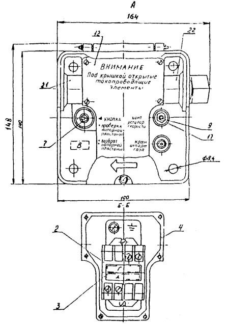 6.1 - верхний поплавок; 6.2 - нижний поплавок. Остальные обозначения см. на рисунке 8. Рисунок 9 - Блок контактный реагирующий БКР2 На наружной поверхности крышки коробки зажимов нанесены оперативные надписи, поясняющие порядок работы с элементами управления и контроля блока. На внешней боковой