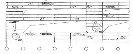 При составлении карт дефекты и повреждения, а также намечаемые места отбора проб материалов наносятся на специальные планы, разрезы и развертки соответствующих конструкций с привязкой к осям или характерным линиям конструкций.