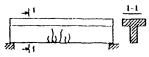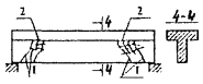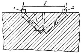 где h - глубина трещины, см; V - скорость распространения ультразвука на участке бетона без трещин, см/мкс; tе - время распространения ультразвука на участке бетона с трещиной, мкс; tа - время распространения ультразвука на участке бетона без трещины, мкс; ℓ - база прозвучивания для обоих участков, см. 1 - излучатель; 2 - приемник Рисунок 1 - Определение глубины трещин в конструкции 5.7 Время появления трещин необходимо установить в процессе анализа эксплуатационной документации или (в случае отсутствия соответствующих записей) путем опроса эксплуатационного персонала. Старые трещины обычно загрязнены, новые имеют свежий вид. 5.8 Если в процессе обследования железобетонных конструкций возникает предположение, что обнаруженные трещины продолжают развиваться, то за ними необходимо установить наблюдение с помощью маяков (гипсовых, пластинчатых или рычажных). 5.9 При обследовании железобетонных конструкций необходимо фиксировать трещины, оказывающие вредное воздействие на состояние конструкций: - трещины, ширина раскрытия которых превышает значения, предусмотренные нормами; - наклонные трещины в растянутой зоне от поперечных сил; - поперечные и наклонные трещины по всей высоте сечения элементов; - продольные трещины в сжатой зоне элементов конструкций; - продольные трещины вдоль продольной и поперечной арматуры. 5.10 При анализе трещин следует знать, что по своим свойствам, характеристикам, размерам, геометрической форме и направлениям трещины могут быть стабилизировавшимися и не стабилизировавшимися во времени, раскрытыми и сквозными, волосяными (до 0,1 мм), мелкими (до 0,3 мм), развитыми (0,3 - 0,5 мм), поверхностными, вертикальными и горизонтальными, поперечными и продольными. 5.11 При установлении причин увеличенного раскрытия трещин и образования недопустимых трещин следует исходить из того, что, как правило, они могут явиться следствием: - увеличения усилий в элементах конструкций, вызванных различными причинами (статические и динамические перегрузки, температурные деформации, перераспределение усилий в связи с деформациями оснований и пр.); - снижения прочностных характеристик бетона при систематических увлажнениях конструкций, замасливании и агрессивных воздействиях среды; - несоблюдения требований технологии изготовления железобетонных элементов как заводского изготовления, так и при монолитном исполнении; - потери сцепления арматуры с бетоном. 5.12 Трещины в защитном слое бетона, ориентированные вдоль стержней продольной и поперечной арматуры, образуются вследствие распирания бетона продуктами коррозии арматуры. 5.13 Характерными трещинами в элементах конструкций являются трещины, образовавшиеся в результате переармирования железобетонных конструкций. Усадка бетона в данном случае является причиной появления трещин. Идентичные трещины появляются в железобетонных конструкциях от влияния на них температуры. 5.14 Вертикальные трещины в изгибаемых элементах раскрытием выше допустимых пределов (более 0,3 - 0,5 мм) могут служить признаком перегрузки конструкции или недостаточной несущей способности по изгибающему моменту. Раскрытие трещин в изгибаемых конструкциях до 0,5 - 1 мм может свидетельствовать об образовании пластических деформаций вследствие перегрузки, а раскрытие трещин до значений, измеряемых несколькими миллим