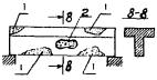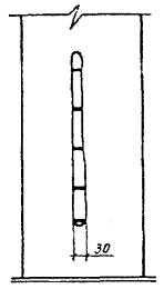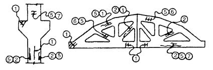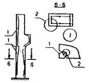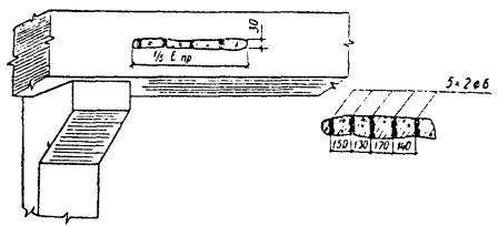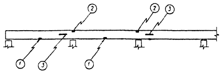 где α - коэффициент, учитывающий влияние статического характера тарировочных связей; β - коэффициент, учитывающий влияние осреднения результатов при прозвучивании бетона толщиной более 0,2 м; Rcp - средняя прочность бетона в зоне контроля, МПа (кгс/см2); Ri - частные значения прочности бетона в зоне контроля, МПа (кгс/см2); n - число частных значений. 6.4.9 Технические характеристики некоторых приборов для определения прочности бетона ультразвуковым методом приведены в приложении И. 6.5 В процессе обследования при некоторых условиях с целью определения фактической прочности бетона конструкций необходимо использовать лабораторный метод с предварительным выбуриванием кернов. Керны выбуриваются с помощью бурового станка с применением алмазных коронок. Образцы из выбуренных кернов подготавливаются для испытания на камнерезном станке. Подготовленные образцы испытываются по ГОСТ 10180-90 [9], ГОСТ 12730.0-78 [11], ГОСТ 17624-87 [18], ГОСТ 22690-88 [23] с получением прочности при сжатии, объемной массы и водопоглощения (пористости). 7 ВЫЯВЛЕНИЕ ФАКТИЧЕСКОГО АРМИРОВАНИЯ ЖЕЛЕЗОБЕТОННЫХ ЭЛЕМЕНТОВ СТРОИТЕЛЬНЫХ КОНСТРУКЦИЙ7.1 При отсутствии проектных данных об армировании и состоянии железобетонных конструкций, вызывающих сомнение в качестве армирования, необходимо выполнить работу по выявлению фактического армирования. 7.2 Для выявления армирования железобетонных конструкций существует несколько способов: - вскрытие арматуры ответственных сечений с ее обнажением; - сквозное просвечивание конструкций по ГОСТ 17623-87 [17]; - электромагнитный способ по ГОСТ 22904-93 [25]. В условиях эксплуатации железобетонных конструкций наиболее приемлемо вскрытие арматуры на заранее намеченных расчетных сечениях. Вскрытие арматуры допускается на определенных участках. 7.3 Места вскрытия должны быть выбраны с учетом напряженного состояния элементов железобетонных конструкций. При определении мест вскрытия следует максимально использовать имеющиеся дефектные участки с наличием отслоений защитного слоя, продольных трещин, сколов, участков с механическими повреждениями и т.д. 7.4 Вскрытие арматуры производится в следующей последовательности: - намечаются места вскрытий; - прорубаются штрабы в намеченных местах; - измеряются диаметры арматуры, толщина защитного слоя, геометрические размеры вскрытых сечений; - вырезаются стержни арматуры для изготовления образцов, подлежащих испытанию (с предварительным усилением ослабленных стержней); - заделываются места вскрытий цементным раствором не ниже марки 200 с предварительной их расчисткой и промывкой водой. Для обнажения стержней арматуры с целью измерений их диаметров и расположения в сечении необходимо удалить слой бетона. 7.5 В изгибаемых многопролетных железобетонных балках, например, необходимо вскрывать: - продольную арматуру в середине пролета (снизу); - продольную арматуру над опорами; - поперечную арматуру у опор. Места вскрытий арматуры в многопролетной балке и характер вскрытий представлены на рисунке 2. 1 - продольная арматура в середине пролета; 2 - продольная арматура над опорами; 3 - поперечная арматура у опор Рисунок 2 - Места вскрытий арматуры в многопролетной балке 7.6 Вскрытие продольной арматуры изгибаемых железобетонных элементов следует производить лишь в растянутых зонах, поскольку в изгибаемых железобетонных эле
