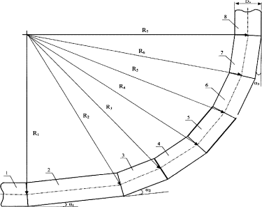 Рис. 1. Эскиз сварного колена с углом поворота трубопровода на 90°. 1 - первый элемент колена, являющийся торцем трубы конечного прямолинейного участка трубопровода перед поворотом; 2-7 - отдельные элементы колена; 8 - восьмой элемент колена, являющийся торцем трубы начального прямолинейного участка трубопровода после поворота; DH - наружный диаметр трубопровода; a1 = 7,5° - угол между осями первого и второго элементов колена; a2 = 15° - угол между осями элементов колена со второго по седьмой; a3 = 7,5° - угол между осями седьмого и восьмого элементов колена. R1/Dн = 6,875 R2/Dн = 7,450 R3/Dн = 7,730 R4/Dн = 8,209 R5/Dн = 8,419 R6/Dн = 8,541 R7/Dн = 8,575 На рис. 2 показаны элементы колена на входе в поворот трубопровода, а на рис. 3 - элементы колена на выходе из поворота трубопровода, где: 1 - первый элемент колена, являющийся торцем трубы конечного прямолинейного участка трубопровода перед поворотом; 2-7 - отдельные элементы колена; 8 - восьмой элемент колена, являющийся торцем трубы начального прямолинейного участка трубопровода после поворота; Dн - наружный диаметр трубопровода; a1 = 7,5° - угол между осями первого и второго элементов колена; a2 = 15° - угол между осями элементов колена со второго по седьмой; a3 = 7,5° - угол между осями седьмого и восьмого элементов колена