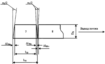 Рис. 3. Элементы колена на выходе потока из поворота трубопровода 2.2. Определение геометрических размеров элементов сварных колен поворотов трубопроводов оптимальной формы2.2.1. Определение геометрических размеров элементов сварного колена оптимальной формы с поворотом трубопровода на 90°. Угол атаки пылевоздушного потока по отношению к поверхности второго-седьмого элементов в соответствии с п. 2.1.1 принят равным 7,5°, что обеспечивает суммарный угол поворота потока в шести элементах колена 90° из-за равенства углов падения и отражения потока. В связи с этим: - угол между осями первого и второго элементов колена a1 = 7,5°; - угол между осями элементов колена со второго по седьмой a2 = 15°. - угол между осями седьмого и восьмого элементов колена a3 = 7,5°; Размеры 1-го элемента колена Расчет уменьшения длины внутренней образующей 1-го элемента колена: Dl1B = tg (a1 / 2) · Dн = tg 3,75° · Dн = 0,066Dн Размеры 2-го элемента колена Расчет уменьшения длины внутренней образующей 2-го элемента колена в районе левого торца: Dl2Вл = tg (a1 / 2) · Dн = tg 3,75° · Dн = 0,066Dн Расчет уменьшения длины внутренней образующей 2-го элемента колена в районе правого торца: Dl2Вп = tg (a2 / 2) · Dн = tg 7,5° · Dн = 0,132Dн Расчет длины внешней образующей 2-го элемента колена: l2H = 0,5D/sin a1 = 0,5D/sin 7,5° = 3,831Dн Размеры 3-го элемента колена Расчет уменьшения длины внутренней образующей 3-го элемента колена в районе левого торца: Dl3Вл = tg (a2 / 2) · Dн = tg 7,5° · Dн = 0,132Dн Расчет уменьшения длины внутренней образующей 3-го элемента колена в районе правого торца: Dl3Вп = tg (a2 / 2) · Dн = tg 7,5° · Dн = 0,132Dн Расчет длины внешней образующей 3-го элемента колена: L3H = 0,5D/sin a1 = 0,5D/sin 15° = 1,932Dн Размеры 4¸6-го элементов колена Размеры 4¸6-го элементов колена идентичны размерам 3-го элемента колена. Размеры 7-го элемента колена Расчет уменьшения длины внутренней образующей 7-го элемента колена в районе левого торца: Dl7Вл = tg (a2 / 2) · Dн = tg 7,5° · Dн = 0,132Dн Расчет уменьшения длины внутренней образующей 7-го элемента колена в районе правого торца: Dl7Вп = tg (a3 / 2) · Dн = tg 3,75° · Dн = 0,066Dн Расчет длины внешней образующей 7-го элемента колена: L7H = 0,5D/sin a2 = 0,5D/sin 15° = 1,932Dн Размеры 8-го элемента колена Расчет уменьшения длины внутренней образующей 8-го элемента колена: Dl8В = tg (a3 / 2) · Dн = tg 3,75° · Dн = 0,066Dн 2.2.2. Определение геометрических размеров элементов колена оптимальной формы с поворотом трубопровода на угол aпов, отличающийся от 90°. 2.2.2.1. 0° < aпов < 7,5° Колено состоит из двух элементов и выполняется в виде стыка двух прямолинейных участков труб. При этом a1 = aпов, а уменьшение длины внутренней образующей 1-го и 2-го элементов колена определяется по формуле: Dl1В = Dl2В = tg(aпов / 2) · Dн 2.2.2.2. 7,5° £ aпов £ 30° Определение углов a1, a2, a3 a1 = a3 = aпов / 4, a2 = aпов / 2 Размеры 1-го и 3-го элементов колена Расчет уменьшения длины внутренней образующей 1-го и 3-го элементов колена: Dl1В = Dl3В = tg(aпов / 8) · Dн Размеры 2-го элемента колена Расчет уменьшения длины внутренней образующей 2-го элемента колена в районе левого торца: Dl2Вл = tg(aпов / 8) · Dн Расчет уменьшения длины внутренней образующей 2-го элемента колена в районе правого торца: Dl2Вп = tg(aпов / 8) · Dн Расчет длины внешней образующей 2-го элемента колена: l2H = 0,5Dн / sin (aпов / 4) 2.2.2.3. 30° < aпов < 90° Угол a1 принимается равным 7,5°, угол a2 принимается равным 15°, угол a3 определяется по формуле: a3 = aпов - a1 - a2 · nэ, где nэ - целое число элементов колена с углом a2 = 15° с округлением в меньшую сторону, определяемое по 