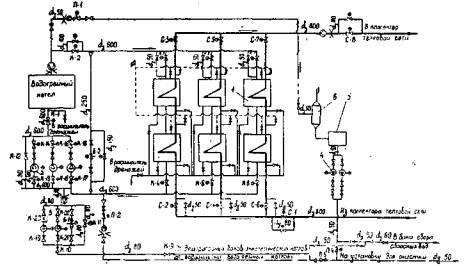 2.1.17. Включите в работу НПЗК: откройте вентиль К-20 на стороне нагнетания насоса; включите в работу резервный НПЗК, откройте вентиль К-22 на стороне нагнетания резервного насоса и поставьте его на АВР; после проверки работы резервного насоса остановите его и оставьте на АВР. 2.1.18. Откройте периодическую продувку котла, для чего: откройте ручную арматуру и регулирующую задвижку П-1 на трубопроводе периодической продувки котла; включите в работу расширитель дренажей и периодической продувки и насос откачки из бака сливов, открыв соответствующую ручную запорную арматуру насоса откачки из бака сливов; в случае отсутствия установки для очистки производственных конденсатов периодическую продувку котла направьте в бак сбора сбросных вод, открыв соответствующую ручную арматуру; охлажденную в баке продувочную воду котла с температурой не выше 30°С подайте на ВПУ. 2.1.19. Заполните котел подпиточной водой, после появления воды в воздушниках закройте их. 2.1.20. Заполните теплообменники и их байпас контурной водой, для чего: откройте байпас задвижки К-2 на трубопроводе контурной воды на выходе из котла в теплообменники; откройте все воздушники на теплообменниках; откройте байпасы вентилей К-3, К-5 и К-7 на трубопроводах подвода контурной воды в теплообменники; заполнение теплообменников заканчивайте после появления воды из всех воздушников и равенства температуры воды на входе и выходе каждого теплообменника; закройте все воздушники на корпусах теплообменников; откройте регулирующий клапан Б-2 и ручные вентили на Трубопроводе байпаса теплообменников. 2.1.21. Скорость прогрева теплообменников не должна превышать 60°С в час для теплообменников, устанавливаемых в обогреваемых помещениях, и 30°С в час (ОСТ 26-291-87) в неотапливаемых помещениях или на улице. 2.1.22. После повышения температуры контурной воды в теплообменниках практически до температуры обратной сетевой воды (Dt не более 40°С) заполните трубное пространство теплообменников сетевой водой, для чего откройте байпасы вентилей С-1, С-2, С-4, С-6, С-8, а также вентили С-3, С-5 и С-7; при появлении воды из воздушников закройте их. 2.1.23. Осмотрите котел, убедитесь в отсутствии течей в элементах котла и теплообменников. 2.1.24. Закройте все лазы и смотровые лючки. 2.1.25. При растопке и работе котла на мазуте подготовьте для заполнения мазутопроводы котла, при этом: 2.1.25.1. Проверьте давление мазута в общем мазутопроводе котельной - оно должно быть не ниже 2 МПа (20 кгс/см2). 2.1.25.2. Проверьте закрытие всех вентилей и наличие всех заглушек на линии подачи пара в мазутопровод котла и на линии в дренажный коллектор (рис. 2).