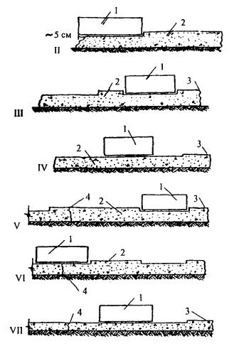 Рис. 2. Схема уплотнения свежеуложенных первой и примыкающих полос покрытия из укатанного бетона (поперечный разрез): 1 - валец катка; 2 - покрытие из свежеуложенного бетона; 3 - неуплотненный продольный край 30-45 см; 4 - продольный «свежий» шов; II-VII - этапы уплотнения свежеуложенного бетона Рис. 3. Схема уплотнения примыкающей к затвердевшему бетону продольной полосы покрытия с устройством «холодного» продольного шва: 1 - валец катка; 2 - покрытие из свежеуложенного бетона; 3 - продольный свежий шов; 4 - уплотненный бетон; 5 - затвердевший бетон; 6 - нож грейдера; 7 - перекрытый (на ~7 см) «холодный» шов свежим бетоном; 8 - перемещение свежеуложенного бетона за пределы «холодного» шва; 9 - уплотнение свежеуложенного бетона над «холодным» швом; 10 - «холодный» шов; I-V - этапы образования «холодного» шва; II-VII - этапы уплотнения свежеуложенного бетона До достижения требуемой плотности уплотнение повторяют по приведенной схеме. В течение процесса уплотнения каток с включенными вибраторами останавливать нельзя. Вибраторы выключают за 1 - 1,5 м до остановки катка. В противном случае образуются просадки на покрытии. Машинист должен регулировать скорость движения катка (3 - 3,2 км/ч), амплитуду и частоту колебаний вальца. После двух проходов катками на пневмошинах рекомендуется сразу же производить уплотнение виброкатком, следом за которым можно использовать легкий двухвальцовый каток. 6.2.8. Вибраторы необходимо включать и выключать за пределами уплотняемой полосы при движении катка. 6.2.9. В исключительных случаях при необходимости остановки катка на уплотняемом слое следует предварительно выключить вибрацию за 1,5 - 2 м до полной остановки катка. 6.2.10. Очищать и увлажнять вальцы катка следует за пределами уплотняемого слоя. 6.2.11. Во время уплотнения цементобетонной смеси катки должны быть в непрерывном и равномерном движении. Запрещается останавливать катки на неуплотненном слое или резко менять направление движения. 6.2.12. Переезд катка с одной уплотняемой полосы на другую необходимо осуществлять только по ранее уплотненному участку. 6.2.13. Бетонную смесь уплотняют до плотности, характеризующейся коэффициентом уплотнения К = 0,98 от полученной при подборе бетона. Ориентировочным признаком окончания уплотнения является отсутствие следа на поверхности слоя при проходе тяжелого катка. Окончательное заключение о достигнутой степени уплотнения следует давать по результатам лабораторного контроля. 6.2.14. Швы сжатия нарезают в затвердевшем бетоне одним диском в соответствии с проектом, ВСН 139-80 и требованиями п. 5.10 настоящих Рекомендаций. 6.2.15. Рабочие швы в конце смены следует устраивать с помощью металлических упорных конструкций на всю ширину и высоту укладываемого слоя. Допускается устраивать рабочий шов с применением деревянных упорных досок. Конструкции или упорные доски следует закреплять штырями. Вдоль рабочего шва смесь необходимо дополнительно уплотнять трамбовками с отделкой поверхности вручную, подсыпая смесь на полосе шириной до 0,50 м. В начале следующей смены доску следует убрать и смесь уложить в стык к ранее уложенной. Как правило, рабочие швы должны совпадать с предусмотренными проектом швами сжатия. Допускается в конце смены производить раскатку бетона с образованием пандуса с последующей обрезкой бетона нарезчиком швов и образованием ра