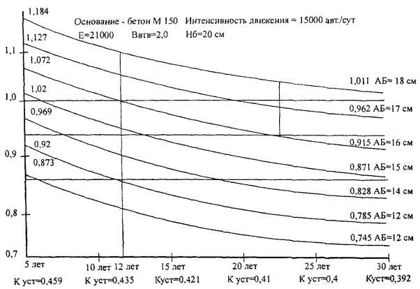 При Расчеты толщин конструктивных слоев проводят по периодам, увязанным с изменением интенсивности движения и межремонтными сроками службы покрытия. С этой целью по формуле 6 определяют периоды времени, когда интенсивность расчетной нагрузки достигнет значений, указанных в табл. 1. В течение каждого периода дорожная одежда работает с принятой надежностью. Задав толщину слоя основания и класс прочности бетона путем подбора толщины слоя асфальтобетона, строят график, показывающий изменение коэффициента прочности дорожной одежды в процессе эксплуатации. По оси абсцисс откладывают срок эксплуатации и соответствующую ему интенсивность расчетной нагрузки. По оси ординат - коэффициент прочности. Определение требуемой толщины асфальтобетонного покрытия по периодам показано на графике стрелками (диаграмма № 1). Принимая различные толщины слоев основания и различные классы бетона, можно получить набор равнопрочных конструкций и затем путем технико-экономического анализа выбрать конструкцию с минимальной стоимостью. При усилении конструкции при достижении коэффициента прочности Кпр = 0,87 слоем асфальтобетона следует учитывать износ покрытия. С учетом точности расчетов его можно принять D = 1 мм/год. Толщину слоя асфальтобетона рассчитывают из условия, чтобы к году, когда интенсивность движения расчетного автомобиля достигнет 1000 авт./сут, коэффициент прочности был равен Кпр = 0,94. Следующее усиление конструкции производят в год, когда интенсивность движения расчетного автомобиля достигнет 1000 авт./сут. Толщину слоя асфальтобетона рассчитывают из условия, чтобы к концу срока службы коэффициент прочности был Kпр = 1. Для практических расчетов разработана программа расчета на ПЭВМ, позволяющая найти оптимальную конструкцию.