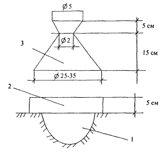Приложение 2МЕТОДИКА ИЗГОТОВЛЕНИЯ ОБРАЗЦОВ ПРИ ПОДБОРЕ БЕТОННОЙ СМЕСИ И ЛАБОРАТОРНОМ КОНТРОЛЕИзготовление контрольных образцов может осуществляться одним из предложенных способов: · формованием на прессе в формах-цилиндрах Æ 100-150 мм: 1. Уплотняющая нагрузка должна быть 30 МПа (300 кг/см2), время приложения нагрузки - 3 мин. На каждый вид и срок испытания изготавливают не менее 3 образцов. Высота образца после уплотнения должна быть 100 ± 2 мм. Массу навески бетонной смеси рассчитывают по теоретической насыпной плотности бетона и объему образца. 2. Форму со вставленным нижним вкладышем протирают влажной тканью и наполняют предварительно взвешенной цементобетонной смесью через металлическую воронку. Смесь укладывают в два слоя, каждый равномерно распределяют и штыкуют смесь в форме ножом или шпателем 15 раз; затем вставляют верхний вкладыш и устанавливают форму на нижнюю плиту пресса для уплотнения. Нагрузку доводят до 30,0 МПа и выдерживают 3 мин; после чего нагрузку снимают, а образец извлекают из формы выжимным приспособлением. Не допускается отделение воды из бетонной смеси при ее формовании. Если наблюдается водоотделение или коэффициент уплотнения менее Ку = 0,98, состав бетона должен быть откорректирован. Образцы с дефектами (облом кромок и непараллельность верхней и нижней граней, раковины на боковой поверхности) выбраковываются. · Вибрирование с пригрузом: 1. Изготовление образцов должно осуществляться в формах-кубах 10 ´ 10 ´ 10 см или формах-призмах 10 ´ 10 ´ 40 см вибрированием с пригрузом на стандартной лабораторной виброплощадке в течение 3 мин. Вес пригруза 40 г/см2. 2. Способ и режим твердения образцов бетона следует осуществлять по ГОСТ 10180-90 и ГОСТ 18105-86. Приложение 3ОПРЕДЕЛЕНИЕ ПЛОТНОСТИ СВЕЖЕУЛОЖЕННОГО БЕТОНА1. Метод замещения объема. В уложенном слое делают лунки диаметром около 25 см. Материал тщательно выбирают из лунок и помещают в резиновые или целлофановые мешки, плотно завязывают, чтобы сохранить влажность отобранной бетонной смеси. Для определения объема лунок над каждой из них устанавливают кольцо и воронку (см. рисунок). Через воронку лунку заполняют до краев кольца одномерным сухим песком средней крупности. Для нахождения объема лунок и кольца песок насыпают мерными сосудами емкостью 2, 1, 0,5, 0,25 л (с делениями). Среднюю плотность свежеуложенного бетона вычисляют по формуле