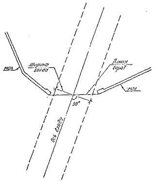 16.1.4. Структура грузооборота комплекса, специализированного для обработки накатных судов, состоящего из контейнеров и подвижной техники, по основным транспортно-перегрузочным признакам подразделяется на 6 групп: 1 - грузовые контейнеры, погрузка, выгрузка и перемещение по территории ПК которых выполняется погрузчиками (фронтальными, портальными), кранами и причальными контейнерными перегружателями; 2 - легковые автомобили, погрузка-выгрузка которых выполняется своим ходом портовыми водителями; 3 - грузовая и специальная самоходная техника, погрузка-выгрузка которой выполняется "своим ходом" портовыми водителями, а также грузоподъемными машинами; 4 - несамоходная техника, при погрузке-выгрузке которой требуется применять портовые тягачи; 5 - УГЕ на несамоходном шасси, погрузка-выгрузка которых выполняется портовыми тягачами; 6 - УГЕ на самоходном шасси, в том числе специализированном для перевозки тяжеловесов, проходящие через комплекс транзитом. 16.1.5. Расчетный грузооборот комплекса определяется в контейнерах. УГЕ и физических единицах подвижной техники и в тоннах проходящего за год через причальный фронт груза, т. е. погруженного или выгруженного из судов. Средняя загрузка контейнеров и УГЕ устанавливается заданием на проектирование. 16.1.6. Производительность перегрузки контейнеров. УГЕ и подвижной техники определяется при проектировании для конкретной схемы механизации в час, смену и сутки, а по неукрупненным грузам в тоннах за смену и сутки. 16.1.7. Все внутрипортовые грузовые и оперативные площадки, проезды, дороги и подъезды должны иметь усовершенствованные постоянные покрытия. 16.2. Определение параметров комплекса. 10.2.1. Причальный фронт 16.2.1.1. Длина причального фронта Lм равна протяженности всех причалов, входящих в ПК. Для комплекса, рассчитанного на обработку одного судна с прямой аппарелью, длина причального фронта Lм определяется по формуле Lм = Lпр + Lмп, (53) где: Lпр - длина причала, м; Lмп - длина площадки для приема и обработки судна с прямой аппарелью, Lмп = 2,3lтп + l0, м; lтп - длина магистрального тягача с полуприцепом, раина 15,3м; l0 - длина участка опирания прямой аппарели на площадку (определяется в зависимости от расчетного типа судна), м. Для судна с угловой аппарелью Lм = Lпр. 16.2.1.2. Ширина причального фронта Вм определяется (см. Приложение 26 рис. 1) расстоянием от линии кордона до внешней линии проезда (штабеля) сортировочной площадки и представляет собой сумму величины расстояния от линии кордона до оси прикордонного рельса причального перегружателя, ширины его колеи, ширины оперативной площадки для загрузки и разгрузки портовых тягачей и ширины проезда для автотранспортных средств. Расстояние от линии кордона до оси ближайшего подкранового рельса причального контейнерного перегружателя грузоподъемностью до 40 т принимается 2,75 или 4,00 м. Определение этого расстояния производится при конкретном проектировании. Колею подкрановых путей причального контейнерного перегружателя следует принимать 16,8 м. Если его грузоподъемность в перспективе предусматривается не более 35 т, допускается устройство подкрановых путей с колеей 15,3 м. Для облегченных перегружателей допускается колея 10,5 м. При этом должна быть обеспечена безопасность движения технологического и вспомогательного транспорта в пределах колеи. Ширина оперативн