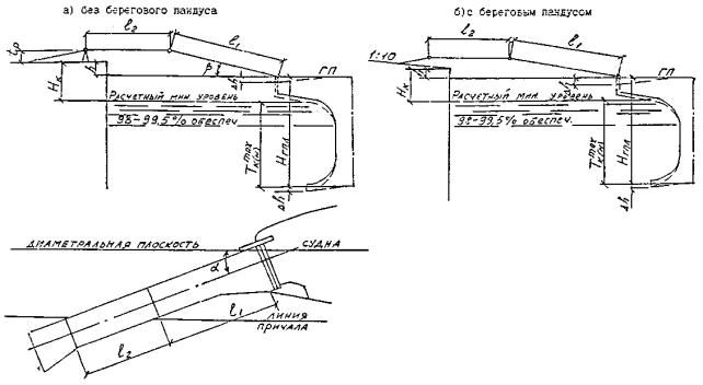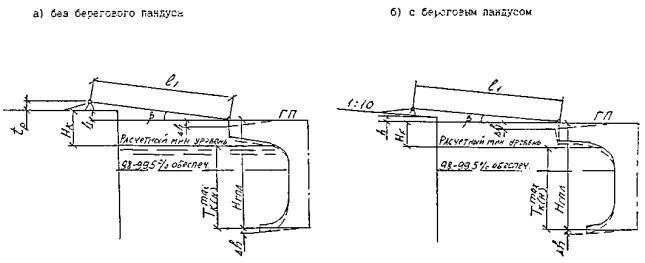 3.3.4. Проектное значение возведения кордона причалов устьевых портов устанавливается в зависимости от характера колебаний уровня воды (в зависимости от преобладающего воздействия морг или реки): в случае преобладающего влияния моря оно рассчитывается в соответствии с п. 3.3.2; в случае преобладающего влияния реки - по СНиП 2.06.01-86. 3.3.5. В случае прокладки в конструкции причала инженерных коммуникаций проектное значение кордона причала может быть увеличено из условия их незатопляемости. 3.3.6. В районах с глубиной промерзания грунта 1,6 м и более проектное значение возвышения кордона должно устанавливаться с учетом требований незамерзаемомости инженерных сетей, проложенных по кордону, а также необходимости прокладки этих сетей выше уровня грунтовых вод. 3.3.7. На перегрузочных комплексах, специализированных для накатных судов, проектное значение возвышения кордона причалов проверяется расчетом на возможность установки аппарели на причал в положение удобное для проведения погрузочно-разгрузочных работ в течение всего периода обработки судна. В случае расхождения полученного значения с проектным значением возвышения кордона в местах сопряжения аппарели с причалом устраивается береговой пандус или мост-рампа, параметры которых рассчитываются при конкретном проектировании. Уклон пандуса не должен превышать отношения 1:10. Пандус, как правило, должен располагаться на концевых участках причалов, не пересекая подкрановых путей прикордонных подъемно-транспортных машин. 3.3.8. Максимальное возвышение кордона причала (берегового пандуса, съезда) определяется для судна в грузу от уровня воды 98 - 99,5%-ной обеспеченности (рис. 5, 6) по формуле: