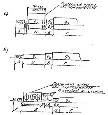 Рис. 17. Компоновка НОГ с портальными кранами 16.2.5.5. Общая длина фронта НОГ включает длину железнодорожной площадки, а также ширину двух боковых проездов. 16.2.5.6. Площадь открытого склада комплектации определяется