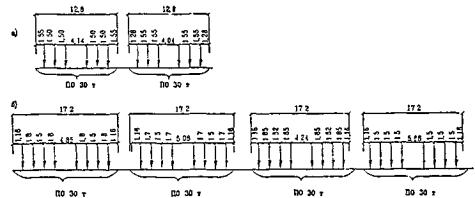 Примечания: 1. Расчетная схема КВ-70 разработана применительно к работе на причалах тяжелых фронтальных погрузчиков и обеспечивает возможность работы любых других (боковых, портальных) типов тяжелых безрельсовых погрузчиков, которые могут перемещаться в прикордонной переходной и тыловой зонах причала как последовательно, так и параллельно друг другу. 2. Расчетная схема КВ-35 позволяет эксплуатировать на проектируемом причале только погрузчики бокового и портального типов. 2. Нагрузки от безрельсового транспорта по схемам Н-30 и Н-10 принимается по СНиП 2.06.04-82. ПРИЛОЖЕНИЕ 7Схема нагрузок от вагонов для перевозки руды с осевым давлением 30 т и нагрузкой 14 тс/м пути.