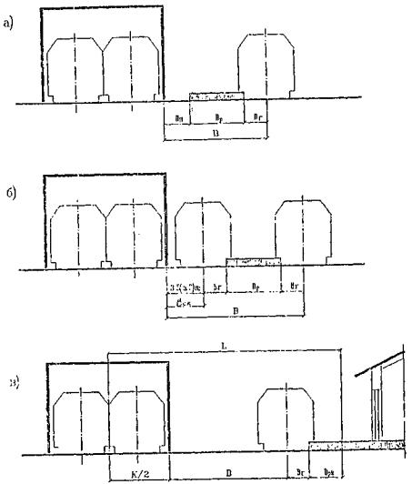 Примечания: 1. При расстоянии от парка более 1 км и количестве ПК (причалов) на участке более четырех в проектах следует проверять расчетом достаточность числа путей, указанного в таблице, и при необходимости увеличивать их количество, либо предусматривать дополнительные подходы железнодорожных путей от парка или принять кольцевую схему (организацию подачи с двух сторон участка). 2. На грузовых фронтах, для которых по технико-экономическим соображениям подачу вагонов совмещают с их уборкой, а расстановку с подборкой по грузовым путям, предусматривают укладку дополнительных железнодорожных путей. Схемы расположения прикордонных железнодорожных путей на ПК с портальными кранами с колеей 10,5 м приведены в Приложении 8. 5.1.8. Количество железнодорожных путей, предназначенных для обработки вагонов у крытых рамповых складов, зависит от взаимного расположения складов: при размещении складов в одну линию со стороны рампы (либо рамп) укладываются два пути (один у рампы грузовой, второй - маневровый); при двух линиях складов, обращенных прирельсовыми рампами друг к другу, укладываются три пути (у рамп грузовые, а средний - маневровый). 5.1.9. Минимальное расстояние от оси ближайшего железнодорожного пути, расположенного вне портала, до подкранового рельса следует принять Вск = 3,5 м. а на участках ПК, перерабатывающих смешанные генеральные грузы (крытого и открытого хранения), и на участках ПК, где между подкрановым рельсом и железнодорожным путем вне портала располагаются электроколонки и могут устанавливаться столы-рампы, это расстояние должно быть принято не менее Вск = 5,3 м. 5.1.10. На участках ПК, перерабатывающих генеральные грузы крытого хранения и имеющих стационарные рампы (в том числе смонтированные из сборных элементов) за тыловой ниткой подкранового пути, расстояние от него до оси железнодорожного пути: при расположении железнодорожного пути с тыловой стороны рампы (рис. 9 "а", схема 1 Приложение 8) определяется по формуле: В = Вн + Вр + Вг, (10)