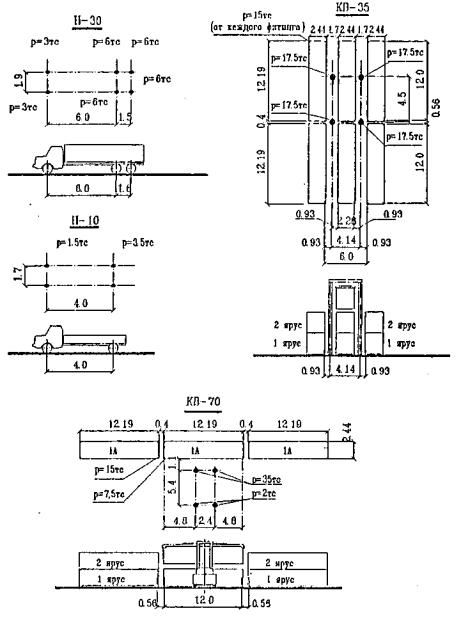 ПРИЛОЖЕНИЕ 6Характеристики нагрузок от безрельсового транспорта.1. Характеристики нормативных нагрузок от безрельсового транспорта по схемам КВ-35 и КВ-70 приведены в табл. 1.