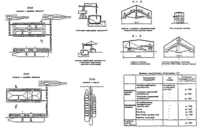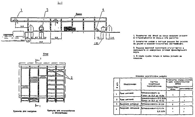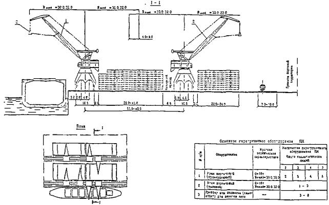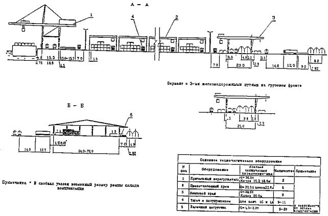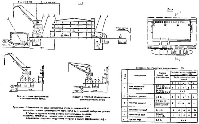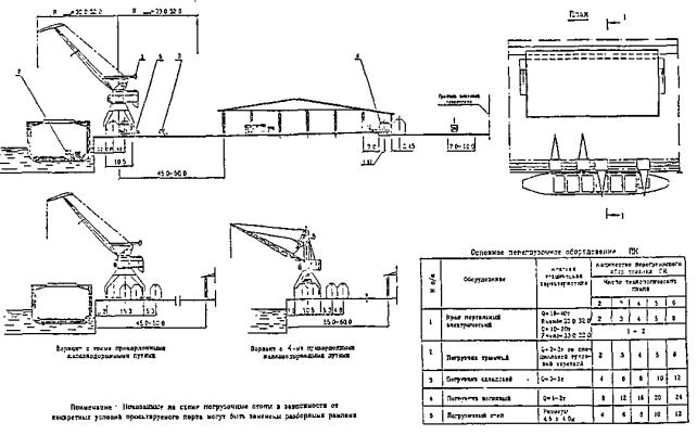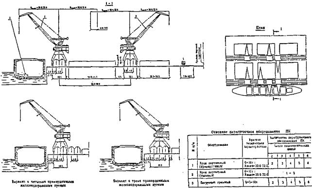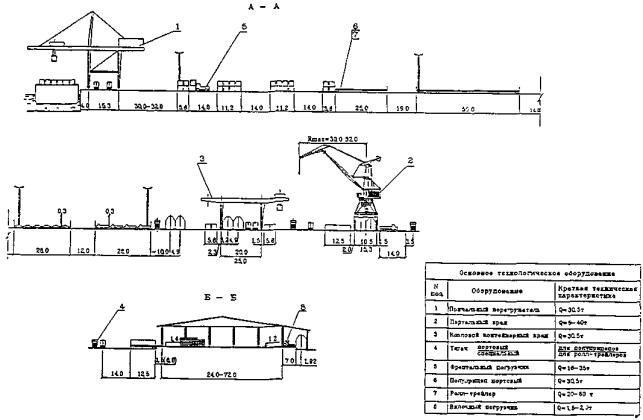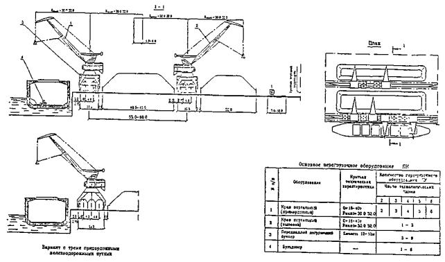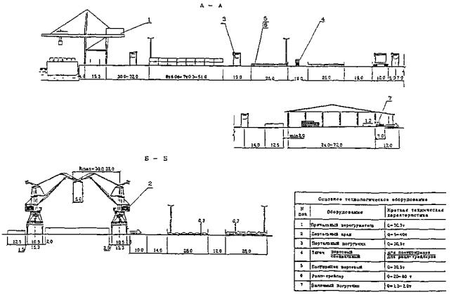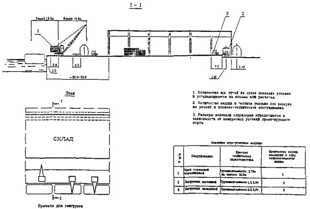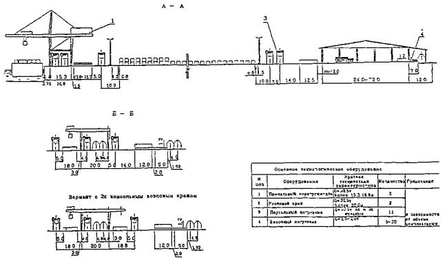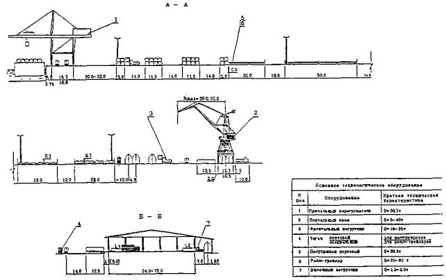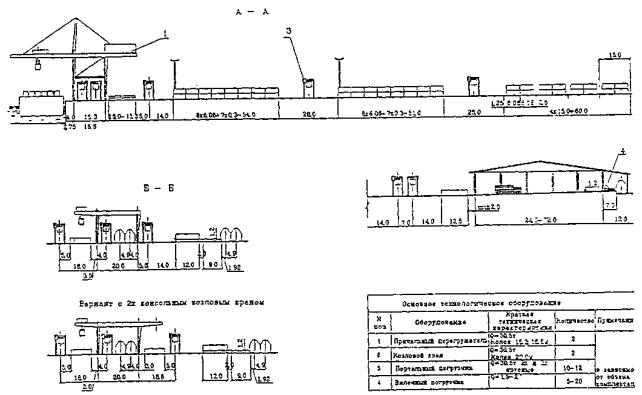 Рис. 6 Схема механизации №3 с использованием портальных погрузчиков. Разрезы. 17. ПЕРЕГРУЗОЧНЫЕ КОМПЛЕКСЫ, СПЕЦИАЛИЗИРОВАННЫЕ ДЛЯ ОБРАБОТКИ СУДОВ ЛИХТЕРОВОЗНОЙ СИСТЕМЫ.17.1. Основные положения. 17.1.1. Основными элементами технологической структуры лихтеровозного комплекса являются: причальные устройства (причалы) для лихтеровозов; накопительно-отстойные бассейны; формировочный рейд; грузовой участок для обработки лихтеров; портовые буксиры; транспортные буксиры. Перечисленные элементы технологической структуры лихтеровозного комплекса, кроме вспомогательных причалов для лихтеров, проектируются согласно требованиям, приведенным в настоящем разделе. Вспомогательные причалы для лихтеров, предназначенные для производственных стоянок, связанных с операциями, выполнение которых нецелесообразно у грузовых причалов (мойка, сушка, санитарная обработка, осмотр, мелкий ремонт лихтеров и др. ) должны проектироваться согласно требованиям Раздела 13. 17.1.2. В зависимости от организации перевозок грузов в лихтерах в проектах следует рассматривать следующие варианты организации лихтеровозных комплексов: выгрузка-погрузка лихтеров с судов-лихтеровозов с последующей транспортировкой в пункты разгрузки-загрузки лихтеров (схема 1, 2, Приложение 27); выгрузка-погрузка лихтеров с судов-лихтеровозов с последующей разгрузкой-загрузкой всего комплекта лихтеров на лихтеровозном комплексе (схема 3, Приложение 27); выгрузка-погрузка лихтеров с судов-лихтеровозов с последующей разгрузкой-загрузкой части лихтеров на лихтеровозном комплексе и транспортировкой другой части лихтеров в пункты разгрузки-загрузки лихтеров (схема 4, 5, Приложение 27). 17.1.3. Требуемый для каждой из приведенных в п. 17.1.2. организации работы лихтеровозных комплексов состав элементов технологической структуры ПК приведен в табл. 100.