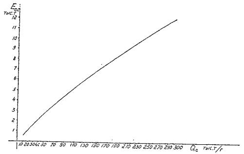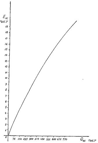 где: Eос - вместимость открытого склада, т; q - техническая нагрузка от складируемого груза применяется равной 4,0 т м2; Kи - коэффициент использования площади открытых складов, следует принимать равными: в зоне действия портальных кранов и перегружателей - 0,80; вне зоны действия портальных кранов и перегружатели - 0,70. 16.2.5.7. Вместимость открытого склада комплектации Eос определяется по графику (рис. 18) в зависимости от объема груза, проходящего через склад Qос.