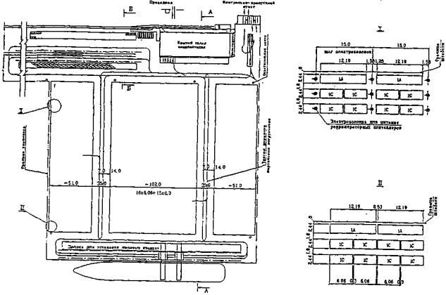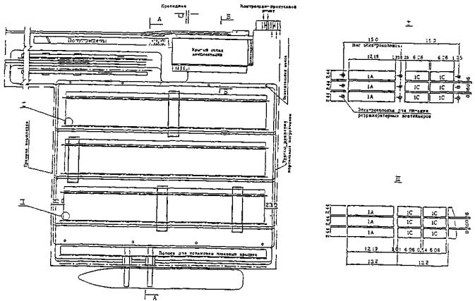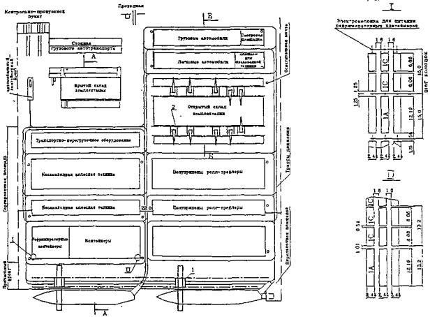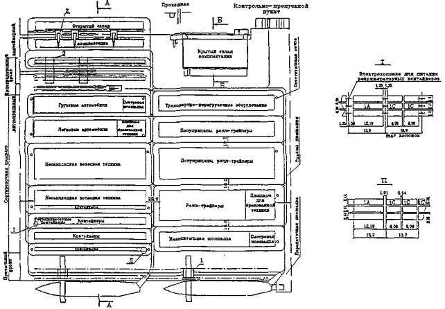 где: P - производительность крана, т/ч; tо - время на перестановку подвижного состава или УГЕ на одну технологическую линию; при перестановке подвижного железнодорожного состава tож = 0,6 ч; при перестановке автотранспорта tоа = 0,12 ч; при перестановке УГЕ tок = 0,15 ч. 16.2.6. Фронт неукрупненных грузов крытого хранения. 16.2.6.1. Фронт неукрупненных грузов крытого хранения (НКГ) содержит: железнодорожную площадку; автомобильную площадку; площадку комплектации и раскомплектации УГЕ; крытый склад комплектации. 16.2.6.2. Функции и параметры технологических элементов фронта НКГ определяются согласно требованиям Раздела 15. 16.3. Требования пожарной безопасности и охраны окружающей среды. 16.3.1. При проектировании перегрузочных комплексов специализированных для накатаных судов, должны быть соблюдены противопожарные требования СНиП 2.01.02-85 и СНиП 2.09.02-85. Противопожарные разрывы между зданиями, размещаемыми на территории комплекса, следует принимать согласно требованиям главы СНиП II-89-80 "Генеральные планы промышленных предприятий". На территорию комплекса должно быть не менее двух въездов. 16.3.2. Открытые сортировочные площадки должны быть оборудованы системой сигнализации с ручными пожарными извещателями, имеющей вывод тревожного сигнала в диспетчерскую. Размещение ручных пожарных извещателей должно соответствовать требованиям СНиП 2.04.09-84 "Пожарная автоматика зданий и сооружений''. 16.3.3. Для целей наружного пожаротушения на комплексе должна предусматриваться система водоснабжения в соответствии со СНиП 2.04.02-84 "Водоснабжение. Наружные сети и сооружения". 16.3.4. При производстве погрузочно-разгрузочных работ следует соблюдать требования безопасности труда, руководствуясь РД "Правила безопасности труда в морских портах". ПРИЛОЖЕНИЕ 26Рекомендуемое Компоновочные схемы перегрузочного комплекса1. Принципиальные компоновочные схемы перегрузочного комплекса (ПК) содержат план и разрезы по основным технологически элементам комплекса и рекомендуемые набор и количество основного технологического оборудования. 2. Компоновка ПК выполнена для трех наиболее часто встречающихся схем механизации, отличающихся типом машин, применяемых для обработки контейнеров на сортировочной площади и железнодорожном контейнерном фронте: схема механизации №1 - с использованием тягачей с полуприцепами (рис. 1 - 2); схема механизации №2 - с использованием фронтальных погрузчиков (рис. 3 - 4); схема механизации №3 - с использованием портальных погрузчиков (рис. 5 - 6). 3. Во всех схемах механизации на причальном грузовом фронте рекомендуется использовать как причальные перегружатели, так и портальные краны на рельсовом и пневмоходу. 4. Сортировочная площадь, как правило, располагается за причальным фронтом и предназначается для складирования контейнеров и подвижной техники (рис. 1 - 6). Контейнеры и подвижная техника устанавливаются в штабели прямоугольной формы параллельно линии кордона. Па сортировочной площади необходимо предусмотреть накопительную площадку для подготовки подвижной техники к погрузке на судно, а также площадку для хранения бракованной техники и смотровую площадку. 5. Железнодорожные фронты для перегрузки контейнеров и подвижной техники (рис. 1 - 4), склады комплектации контейнеров и УГЕ, как правило, должны быть расположены в тыловой части комплекса (рис. 1 - 