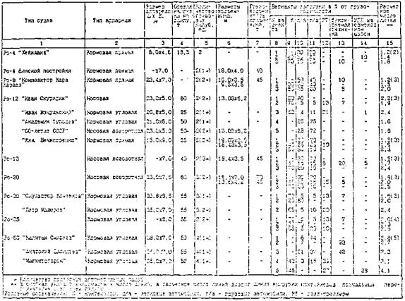 K - коэффициент, учитывающий переход от технической к эксплуатационной производительности технологической линии, при механизированном способе производства грузовых работ. K = 0,75; 1,067 - коэффициент, учитывающий время обеденного перерыва. Техническая производительность технологической линии при погрузке судов с колесной техникой в 1,35 раза ниже, чем при выгрузке. 16.2.1.12. Количество машин в технологической линии для транспортных и складских работ на сортировочной площади при вертикальном способе обработки судна определяется исходя из обеспечения бесперебойной работы причального перегружателя или портального крана, а при горизонтальном способе - исходя из обеспечения бесперебойной работы однотипных машин, образующих линию "причальный фронт-сортировочная площадь". 16.2.1.13. Техническая производительность портальных и фронтальных погрузчиков, тягачей с полуприцепами и специальных тягачей, легковых автомобилей, грузовой и специальной самоходной техники и количество машин в линии в зависимости от типа расчетного судна приведена в табл. 95 (Табл. 95 составлена для выгрузки). Таблица 95