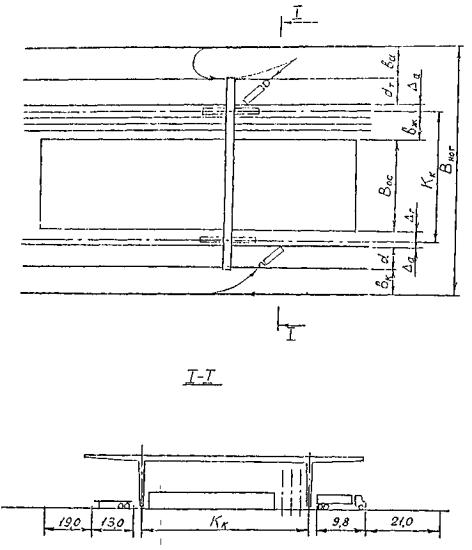 где: Ei - вместимость площадок комплекса для i-го груза ед; Aj - доля судов j-го типа. 16.2.5. Фронт неукрупненных грузов открытого хранения 16.2.5.1. Фронт неукрупненных грузов открытого хранения (НОГ) содержит в своем составе: железнодорожную площадку; автомобильную площадку; площадку комплектации и раскомплектации УГЕ; открытый склад. 16.2.5.2. Для работы на фронте НОГ применяются портальные и козловые краны, а также тягачи для транспортировки УГЕ от площадки комплектации до сортировочной площади и обратно. 16.2.5.3. Общая ширина фронта Bног в случае применения козловых кранов (рис. l5) определяется по формуле Bног = dт + 2∆a + Kк + d + bа + bк, м (71) где: dт - полоса для установки автомобилей под обработку, dт = 10,0 м; ∆a - габариты приближения автотранспорта к оси подкранового рельса, ∆a = 2,0 м; Kк - колея крана определяется при проектировании, м; d - полоса для комплектации и раскомплектации УГЕ, d = 13 м; bа - ширина проезда на автомобильной площадке, bа = 21,0 м; bк - ширина проезда на площадке комплектации, bк = 19,0 м.