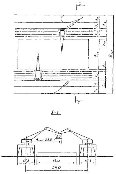 Рис. 16. Схема определения Bос и bж. 16.2.5.4. В случае применения на фронте НОГ портальных кранов в две линии (см. рис. 17) общая ширина фронта Вног определяется Bног = dт + d + bа + bк + 2(∆a + Kк + ∆г), м (73) Ширина открытого склада комплектации Bос определяется Bос = 2Rmax - 5 - Kк - 2∆г, м (74) где: Rmax - максимальный вылет стрелы портального крана, м.
