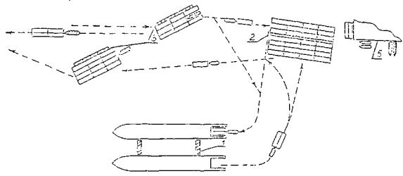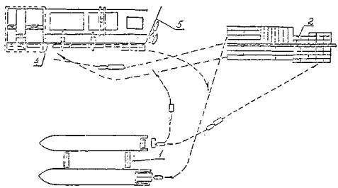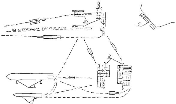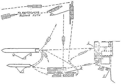 Основные элементы комплекса 1 - причальные устройства для судов-лихтеровозов 2 - накопительно-отстойный бассейн 3 - формировочный рейд 4 - грузовой участок для обработки лихтеров 5 - вспомогательные причалы для лихтеров Функционирование лихтеровозного комплекса по схеме 1
