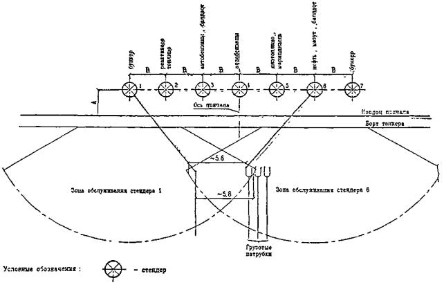 Рис. 20 Схема совмещения зон обслуживания стендеров с зоной расположения судовых приемно-отливных патрубков. Размещение стендеров на причале должно обеспечивать удобство их эксплуатации, монтажа и демонтажа, а также исключать возможность их повреждения при навале обрабатываемого судна. Правильность размещения определяется по зоне действия стендеров в вертикальной плоскости (рис. 21) и горизонтальной плоскости (рис. 22).
