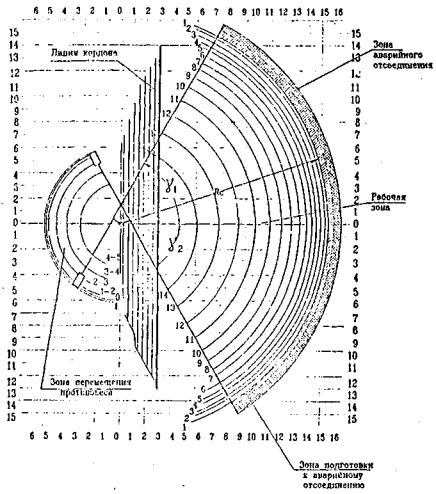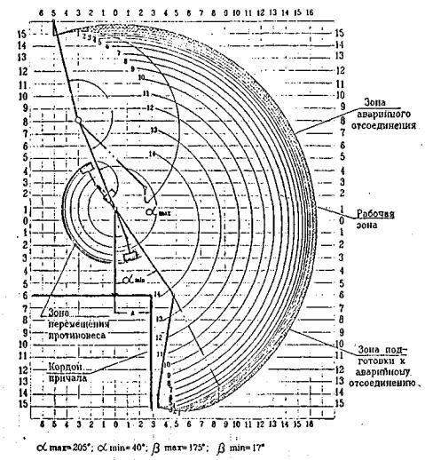 Подготовка к аварийному отсоединению - β от 120° до 170° Аварийное отсоединение - β от 140° до 170° Координатная сетка дана в метрах Рис. 21 Зона действия стендера типа АС-250 в вертикальной плоскости