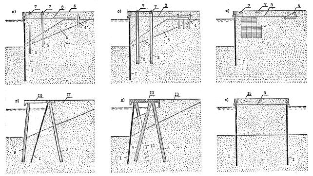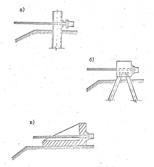 Рис. 9. Варианты креплений стальных канатов к анкерным опорам в виде:а - анкерных стенок; 5.3. Погружение шпунта и свай подкрановых путей может осуществляться как с суши, так и с плавсредств, в зависимости от проектного положения, линии кордона причала относительно уреза воды, наличия технических средств, грунтов основания и т.д. 5.4. Погружение шпунтовых свай в зависимости от грунтов основания, объема пакетов и других условий, может осуществляться при помощи молота, вибромолота или вибратора. 5.5. При строительстве причальных сооружений типа больверк с использованием подкрановых путей на свайном основании (рис.1,а) рекомендуется следующая последовательность производства работ: 5.5.1. Погружение шпунтовых свай для устройства стенки больверка 1. 5.5.2. Отсыпка призмы грунта 5 в районе устройства анкерной стенки 4. 5.5.3. Погружение задней шпунтовой стенки 4, служащей для закрепления анкерных тяг 3. 5.5.4. Установка анкерных тяг 3. 5.5.5. Отсыпка грунта для образования территории 6. Примечание. Отсыпку грунта необходимо производить послойно в направлении от берега к шпунтовой стенке. 5.5.6. Погружение свай подкрановых путей 2. 5.5.7. Устройство верхней надстройки шпунтовой стенки и подкрановых балок. Примечание. До устройства подкрановых балок и надстройки отсыпку грунтавприкордонной зоне следует выполнять до уровня установка анкерных тяг спринятием мер по защите тяг от коррозии. 5.5.8. При использовании под подкрановые пути грунтоцементных и илоцементных свай их устройство выполняют после окончания работ по образованию территории причала. Примечания:1. В морских илах илоцементные сваи изготавливаются на сульфатостойком цементе, на основании установленной в лаборатории дозировки цемента. 2. Состав закрепляющего раствора и его количество на 1 м3 объема сваи устанавливается для конкретных объектов путем сравнительных лабораторных исследований и технико-экономических расчетов. Рецептуру илоцемента следует принимать в соответствии с РД 31.31.29-82. 3. Диаметр свай рекомендуется назначать в пределах от 0,6 до 1 м. 4. При использовании грунтоцементных и илоцементных свай необходимо выполнять требования, изложенные в разделе 6 РД 31.31.29-82. 5.6. Строительство причального сооружения типа больверк с использованием анкерных тяг из стальных канатов необходимо выполнять, соблюдая следующую последовательность работ (рис.1,б): 5.6.1. Погружение свай подкранового пути 2. 5.6.2. Погружение шпунтованных свай для устройства стенки больверка 1. 5.6.3. Отсыпка призмы грунта 5, на которой возводится сооружение 4, служащее для закрепления стальных канатов 3. 5.6.4. Устройство сооружения 4, воспринимающего горизонтальное усилие от закрепления стального каната 3. 5.7. Реконструкцию причальных сооружений при помощи стальных шпунтовых свай, закрепляемых стальными канатами, следует выполнять при соблюдении следующей последовательности производства работ (рис.1,в): 5.7.1. До производства дноуглубительных, работ стальные шпунтовые сваи 1 погружают перед существующим сооружением. 5.7.2. При погружении шпунтовых свай остаются в силе условия, изложенныев п.5.2. 5.7.3. Для того, чтобы не нарушать эксплуатацию железнодорожных путей реконструируемого участка причала, установку стальных канатов производят методом продавливания труб через массив грунта с последующим протягиванием стальных канатов через тр