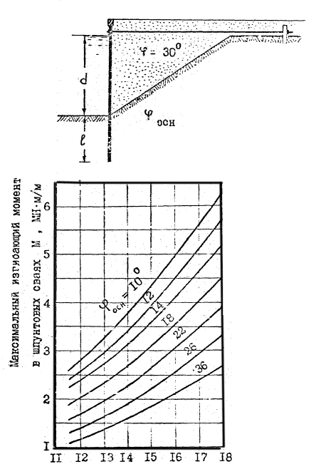 усилий, принимаются в соответствии с 3. Определение Усилий3.1. Расчет нормативных значений изгибающих моментов в лицевой стенке болъверка, напряжений в зоне контакта "свая-грунт" деформаций шпунтовой стенки и перерезывающих сил следует определять сучетом деформации сооружения по программе в ЭВМ, приведенной в РТМ 31.3016-78. 3.2. Влияние нагруженной фундаментной части подкранового пути лицевую стенку больверка следует учитывать, если фундамент полностью расположен в пределах призмы обрушения. В этом случае дополнительную составляющую эпюры бокового давления грунтаот нагруженной фундаментной части следует определять по методике, изложенной в Приложении 1. 3.3. Для предварительного определения величин изгибающих моментов, анкерных усилий и глубин забивки, шпунтовых свай рекомендуется использовать графики, приведенные на рис. 2 - Рис.4. 3.4. Основные характеристики сварного зетового шпунта приведены в Приложении 2, а его расход в конструкции можно оценивать по таблице П. 3.1 Приложения 3. 4. ОСНОВНЫЕ РЕКОМЕНДАЦИИ ПО КОНСТРУИРОВАНИЮ4.1. Отсыпку за стенку причала