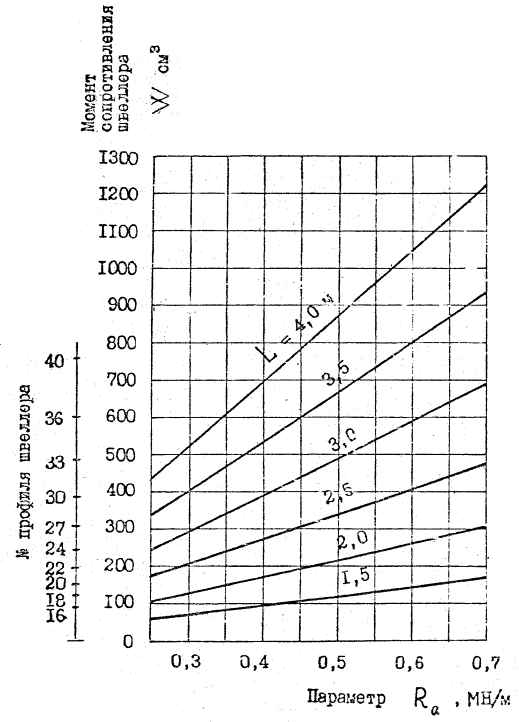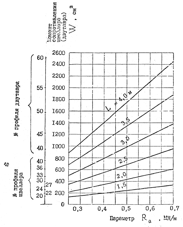 Рис. 7. График зависимости момента сопротивления швеллера (двутавра) от параметра Rа и расстояния между анкерами для варианта крепления в соответствии с рис. 5