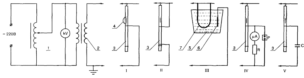 2.1.45. При работе с указателями напряжения импульсного типа следует помнить об импульсном характере индикации напряжения, вследствие чего первая вспышка лампы происходит через 1 - 2 с (после заряда конденсатора до напряжения индикации лампы). Длительность прикосновения указателя к проверяемой токоведущей части должна быть не менее 10 с (при отсутствии сигнала). Испытания указателей напряжения Механические испытания указателей в эксплуатации не проводят. Электрические испытания 2.1.47. Эксплуатационные испытания указателей напряжения заключаются в прикладывании повышенного напряжения отдельно к рабочей и изолирующей частям и в определении напряжения индикации указателя. 2.1.48. При испытании рабочей части повышенное напряжение прикладывают к контакту-наконечнику и винтовому разъему. Если указатель не имеет винтового разъема, соединенного с электрической схемой рабочей части, то у границы последней на ее поверхности устанавливают временный электрод для присоединения провода испытательной установки. Испытательное напряжение для продольной изоляции при этом должно иметь значения: 12 кВ - до 10 кВ; 17 кВ - 15 кВ; 24 кВ - 20 кВ. Продолжительность испытания - 1 мин. В указателях напряжения 35 - 220 кВ рабочую часть не испытывают. 2.1.49. При испытании изолирующей части напряжение прикладывается к резьбовому элементу изолирующей части и временному электроду, наложенному непосредственно у ограничительного кольца со стороны изолирующей части. Изолирующая часть указателей напряжения при этом должна выдерживать в течение 1 мин. 3-кратное линейное напряжение для электроустановок напряжением свыше 1 до 110 кВ и 3-кратное фазное напряжение для электроустановок от 110 кВ и свыше, но не менее следующих значений: 40 кВ - до 10 кВ; 60 кВ - св. 10 до 20 кВ; 105 кВ - св. 20 до 35 кВ; 190 кВ - 110 кВ; 380 кВ - св. 110 до 220 кВ. 2.1.50. Напряжение индикации указателей определяют по той же схеме, по которой испытывают рабочую часть. Правила пользования указателями напряжения 2.1.51. При проверке наличия или отсутствия напряжения указатели не должны заземляться. Исключение составляет применение указателей типов УВН-10 на опорах ВЛ (кроме металлических) или телескопических вышках (гидроподъемниках), о чем подробно указано в п. 2.1.46. 2.1.52. При использовании указателя держать его следует за рукоятку в пределах ограничительного кольца. 2.1.53. Перед началом работы необходимо проверить исправность указателя с помощью специального приспособления (например, типа ППУ-2) или путем прикосновения контактного электрода к токоведущим частям, заведомо находящимся под напряжением. Приспособление применяется при отсутствии в электроустановках токоведущих частей, заведомо находящихся под напряжением (на подстанциях с одним питающим вводом, на трассах кабелей при вскрытии муфт, на одиночных ВЛ, на кабелях электродвигателей и др.)*, и представляет собой малогабаритный прибор со встроенным источником питания, контролем работоспособности, снабженный зарядным устройством. * Проверку исправности указателей напряжения на свече автомашины производить запрещается из-за возможности ложных показаний. 2.1.54. Необходимо помнить, что свечение указателей импульсного типа прерывистое. При отсутствии визуального импульсного сигнала указатель изымается из эксплуатации. 2.1.55. Указатели напряжения могут применяться в наруж