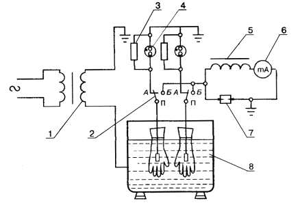 2.1.80. При проверке электрической прочности продольной изоляции рабочих частей испытательное напряжение в течение 1 мин. прикладывается к контактному электроду и элементу резьбового разъема. При этом испытательные напряжения должны иметь значения: 12 кВ - до 10 кВ; 17 кВ - 15 кВ; 24 кВ - 20 кВ; 70 кВ - 35 кВ; 100 кВ - 110 кВ. 2.1.81. При проверке электрической прочности продольной изоляции изолирующих частей испытательное напряжение в течение 5 мин. прикладывается к металлическому разъему и проволочному бандажу, наложенному у ограничительного кольца. При этом испытательные напряжения должны иметь следующие значения: 40 кВ - до 10 кВ; 60 кВ - св. 10 до 20 кВ; 105 кВ - св. 20 до 35 кВ; 190 кВ - 110 кВ. 2.1.82. Гибкий провод испытывают напряжением 20 кВ в течение 1 мин. для указателей до 20 кВ. Провод опускают в ванну с водой так, чтобы расстояние между местом заделки провода и уровнем воды было в пределах 60 - 70 мм. Напряжение прикладывается к контактному электроду и к корпусу металлической ванны. При испытании гибкой связи указателей на напряжение 35 - 110 кВ провод опускают в ванну с водой (отдельно от указателя), причем уровень воды должен быть на 50 мм ниже металлических наконечников. Один вывод испытательного трансформатора присоединяют к металлическим наконечникам провода, другой - к корпусу металлической ванны или электроду, опущенному в воду. Провод должен выдерживать напряжение 50 кВ в течение 1 мин. Правила пользования указателем 2.1.83. Работа указателя обеспечивается только при двухполюсном его подключении к электроустановке. Применение диэлектрических перчаток при этом обязательно. 2.1.84. Исправность указателя проверяется на рабочем месте путем двухполюсного подключения указателя к земле и фазе или к двум фазам (в установках 3 кВ). Сигнальная лампа исправного указателя при этом должна ярко светиться. 2.1.85. Пользоваться указателем при дожде, тумане, снегопаде, сильном ветре, влажности воздуха более 80 % запрещается. Электроизмерительные клещи Назначение и конструкция 2.1.86. Клещи предназначены для измерения тока, напряжения и мощности в электрических цепях до 10 кВ без нарушения их целости. 2.1.87. Принцип действия клещей состоит в том, что ток измеряется трансформатором, вторичная обмотка которого замыкается на измерительную схему. Первичной обмоткой является шина или провод с измеряемым током. 2.1.88. Клещи для работы в электроустановках до 10 кВ состоят из рабочей, изолирующей частей и рукоятки. Рабочую часть составляют разъемный магнитопровод, обмотка и съемный или встроенный измерительный прибор. Корпус измерительного прибора пластмассовый. Магнитопровод выполнен из листовой электротехнической стали. Изолирующая часть с упором и рукоятка должны быть выполнены из электроизоляционного материала. Минимальная длина изолирующей части 380 мм, а рукоятки - 130 мм. 2.1.89. Все отдельные части клещей должны быть прочно и надежно скреплены между собой. 2.1.90. Клещи для электроустановок до 1000 В состоят из рабочей части (разъемный магнитопровод, обмотка и измерительный механизм) и корпуса, являющегося одновременно изолирующей частью с упором и рукояткой. Испытания клещей 2.1.91. Клещи для электроустановок выше 1000 В испытывают при эксплуатационных испытаниях напряжением, равным 3-кратному линейному, но не менее 40 кВ, в течение 5 мин. 2.1.92. Клещи для электроустановок до 1000 В испытывают в течение 5 