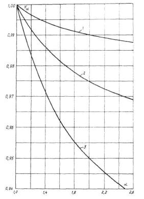 Рис. 1. Зависимость поправочного коэффициента Кα от коэффициента избытка воздуха α: 1 - твердые топлива; 2 - мазут; 3 - природные газы Проверку правильности проведенного газового анализа можно выполнить и по уравнению
