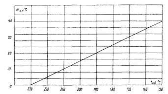 Рис. 3. Пример определения необходимого дополнительного понижения температуры перегретого пара в пароохладителях при понижении температуры питательной воды и сохранении неизменного расхода пара Примечание. График построен исходя из того, что при понижении температуры питательной воды, например с 230 до 150°С, и неизменных паропроизводительности котла и расходе топлива энтальпия пара в пароперегревателе увеличивается (при рп.п = 100 кгс/см2) а 1,15 раза (со 165 до 190 ккал/кг), а температура пара с 510 до 550°С