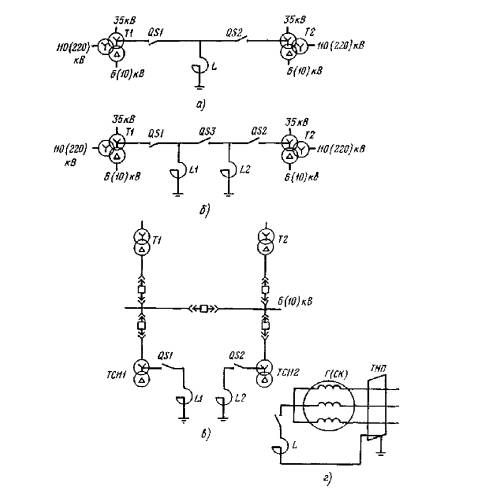 Рис. 1. Схемы включения дугогасящих реакторов: а - включение одного реактора; б - включение двух реакторов; в - включение реакторов в нейтрали трансформаторов СН; г - включение реактора в нейтраль генератора (синхронного компенсатора) 5. НАСТРОЙКА И ЭКСПЛУАТАЦИЯ ДУГОГАСЯЩИХ РЕАКТОРОВ5.1. В сети с компенсацией емкостного тока замыкания на землю напряжение несимметрии и смещения нейтрали не должно превышать указанных в п. 1.6 значений. В сетях 35 кВ выравнивание емкостей фаз относительно земли должно выполняться транспозицией проводов (рис. 2), а также распределением конденсаторов высокочастотной связи. Предварительную оценку напряжения несимметрии сети, а также емкостного тока замыкания на землю следует производить на основании расчетов по удельным емкостям проводов и кабелей относительно земли. Значения удельных емкостей проводов и кабелей и степени несимметрии некоторых линий приведены в приложении 3. Пример расчета напряжения несимметрии сети и выравнивания емкостей фаз приведен в приложении 6. 5.2. Настройка дугогасящих реакторов должна быть выполнена в соответствии с требованиями п. 1.5. 5.3. В случае выбора настройки с недокомпенсацией допустимость такого режима должна быть проверена расчетом значения напряжения смещения нейтрали при появлении несимметрии емкостей фаз сети. Пример расчета зависимости степени смещения нейтрали от степени однофазной несимметрии в сети с недокомпенсацией емкостного тока замыкания на землю при появлении несимметрии емкостей фаз, приведен в приложении 7. 5.4. Методы измерений напряжений несимметрии, смещения нейтрали и определения емкостного тока замыкания на землю с целью настройки компенсации емкостного тока приведены в приложении 8. 5.5. При выборе ответвлений дугогасящих реакторов со ступенчатым регулированием тока необходимо учитывать снижение тока реакторов вследствие влияния сопротивления трансформаторов, в нейтрали которых включены реакторы.