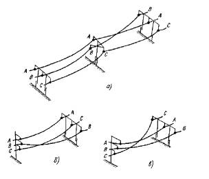 рассчитать длину линий, на которых необходимо выполнить транспозицию проводов. Если Са, Св и Сс - удельные емкости проводов фаз А, В и С, мкф/км, то для выравнивания емкостей следует поменять местами провода фаз А и В на длине