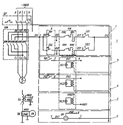 Рис. 3. Электрическая схема управления электроприводом реакторов серии РЗДПОМ: LL - дугогасящий реактор; М - электродвигатель; КМ - магнитный пускатель; QF - выключатель автоматический; RP - потенциометр; SQ - конечный выключатель; 1 - шкаф управления; 2 - местное управление; 3 - крайнее верхнее положение верхней половины стержня; 4 - крайнее нижнее положение верхней половины стержня; 5 - смещение нейтрали; 6 - датчик положения стержня Таблица 5 Характеристика плунжерных дугогасящих реакторов, изготовляемых в ЧССР для двухчасовой продолжительности непрерывной работы