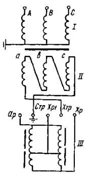 Рис. 4. Электрическая схема дугогасящего устройства ТАДТМ-30/10: I - первичная обмотка; II - вторичная обмотка; III - реактор Приложение 3ЕМКОСТНЫЕ ТОКИ ЗАМЫКАНИЯ НА ЗЕМЛЮ И СТЕПЕНЬ НЕСИММЕТРИИ ЕМКОСТЕЙ ФАЗ ОТНОСИТЕЛЬНО ЗЕМЛИСтепень несимметрии и удельные емкостные токи воздушных линий даны в табл. 8. Удельные емкостные токи кабелей различных сечений и разных номинальных напряжений указаны в табл. 9-11. Емкости проводов воздушных линий определены по формулам Максвелла. Для линии без тросов емкость провода определяется: C1 = C11 + C12 + C13, (14) где С11 - собственная частичная емкость провода относительно земли; C12 и С13 - взаимные частичные емкости относительно второго и третьего провода. Для линии с тросами в выражение (14) добавляются частичные емкости относительно тросов. Частичные емкости определяются по формуле
