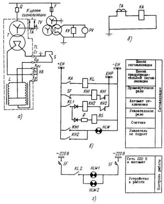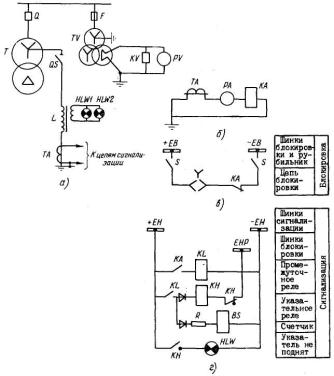 Рис. 5. Схема сигнализации и контроля работы дугогасящего реактора: а - схема первичных соединений; б - схема токовых цепей; в - схема электромагнитной блокировки разъединителя; г - схема сигнализации