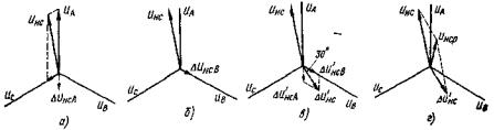где DCк - емкость конденсатора высокочастотной связи, мкФ. При переносе конденсатора, например с фазы А на фазу В, напряжение несимметрии уменьшается в направлении вектора напряжения фазы А на DUнс и увеличивается на то же значение в направлении вектора напряжения фазы В. Общее изменение напряжения несимметрии DUнс рез = Последовательность изменения напряжения несимметрии при переносе конденсатора с фазы А на фазу В показана на рис. 7.
