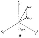 Рис. 8. Определение результирующего напряжения несимметрии сети при подключении линии электропередачи: а - напряжение несимметрии сети до подключения линии; б - напряжение несимметрии подключаемой линии; в - определение результирующего напряжения несимметрии при наивыгоднейшем присоединении линии 4. Числовой пример приведен ниже. Данные для расчета: емкостный ток замыкания на землю сети 35 кВ до подключения новых линий Iс=10 А; вектор степени