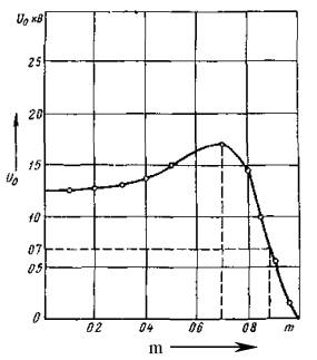 Если в сети линии длиннее lпр отсутствуют, то опасные смещения нейтрали при неполнофазных режимах возникнуть не могут. 3. Числовой пример расчета приведен ниже. Данные для расчета: емкостный ток Ic воздушной сети 35 кВ равен 27 А. Удельный емкостный ток ВЛ ic=0,1 А/км; степень расстройки компенсации J = +0,063; d = 0,05. Расчет Uo = f (m) представлен в табл. 13. Кривая зависимости Uo = f (m) построена на рис. 9. Степени смещения нейтрали Uo = 0,7 соответствует mn = 0,88. Для mn = 0,88 предельная длина линии
