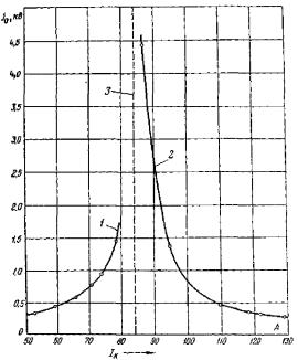Рис. 11. Кривая зависимости напряжения смещения нейтрали от настройки дугогасящего реактора: 1 - область недокомпенсации; 2 - область перекомпенсации; 3 - резонансная настройка Для линий 6-10 кВ, а также линий 35 кВ без тросов принимается коэффициент 2,7; для линий 35 кВ на деревянных опорах с тросами - 3,3; на металлических опорах с тросами - 3,0. Емкостный ток двухцепной линии может быть определен по формуле Iс дв = (1,6¸1,3)Iс одн, (29) где Iс одн - емкостный ток одноцепной линии, А. Увеличение емкостного тока сети за счет емкости оборудования подстанций может ориентировочно оцениваться для воздушных и кабельных сетей 6-10 кВ - на 10 %, для воздушных сетей 35 кВ - на 12 %. Для кабельных сетей 35 кВ увеличение емкостного тока за счет оборудования подстанций учитывать не следует. 4. Определение емкостного тока сети по результатам измерения напряжения смещения нейтрали при разных настройках дугогасящего реактора со ступенчатым регулированием тока (см. рис. 11) производится по формуле