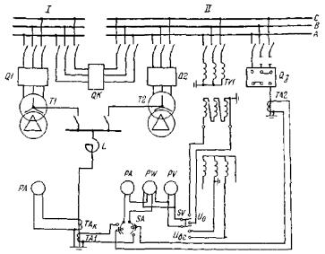 где Iном.т - номинальный ток трансформатора, А; Iк - ток компенсации реактора, А. Трансформаторы, используемые для подключения реакторов, приведены в приложении 4 (табл. 12). 3.4. При отсутствии трансформаторов со схемой соединения обмоток "звезда - треугольник" для подключения реакторов допускается использовать ненагруженные трехфазные трансформаторы со схемой соединения обмоток "звезда - звезда". Мощность трансформаторов при этом должна не менее чем в четыре раза быть больше мощности реакторов. Трансформаторы броневого типа или группы однофазных трансформаторов со схемой соединения обмоток "звезда - звезда" использовать для подключения реакторов недопустимо. 4. СХЕМЫ ВКЛЮЧЕНИЯ ДУГОГАСЯЩИХ РЕАКТОРОВ4.1. Рекомендуемые схемы включения дугогасящих реакторов приведены на рис. 1. Дугогасящие реакторы должны подключаться к нейтралям трансформаторов, генераторов или синхронных компенсаторов через разъединители. В цепи заземления реакторов должен быть установлен трансформатор тока. Трансформаторы 6 (10) кВ с дугогасящими реакторами в нейтрали должны подключаться к шинам подстанций выключателями. При использовании трансформаторов только для подключения реакторов допускается замена выключателей на трехполюсные разъединители. 4.2. На двухтрансформаторных подстанциях схемы включения дугогасящих реакторов должны предусматривать возможность подключения реакторов как к одному, так и к другому трансформатору (рис. 1, а; 1, б). Нейтрали трансформаторов должны быть разделены разъединителями. 4.3. Применение предохранителей в схемах питания трансформаторов с дугогасящими реакторами в нейтрали недопустимо. 4.4. Установка дугогасящих реакторов в распределительных устройствах должна выполнялся в соответствии с действующими Правилами устройства электроустановок и инструкциями заводов-изготовителей. Подключение реакторов к трансформаторам рекомендуется выполнять сталеалюминиевыми проводами или шинами сечением 50-70 мм2. Допускается выполнять подключение кабелем без стальной бронеленты. Неиспользуемые обмотки ненагруженных трансформаторов, в нейтрали которых включены дугогасящие реакторы, должны быть, как правило, заземлены путем соединения одного из выводов обмотки с заземляющим устройством подстанции. 4.5. Рекомендуемые схемы сигнализации и контроля работы дугогасящих реакторов приведены в приложении 5. На сооружаемых и реконструируемых подстанциях приводы разъединителей, которыми дугогасящие реакторы подключаются к нейтралям трансформаторов, должны выполняться с электромагнитной блокировкой, запрещающей отключение под нагрузкой. На действующих подстанциях, на которых разъединители дугогасящих реакторов выполнены без электромагнитной блокировки, допускается эксплуатация реакторов без блокировки. При этом возле разъединителей должны быть установлены две параллельно включенные сигнальные лампы, подключенные к сигнальной обмотке реакторов (две лампы на случай повреждения одной из них).