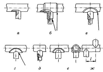 Для соединения фланцев при температуре выше 300 °С и ниже минус 40 °С независимо от давления следует применять шпильки. 2.2.20. При изготовлении шпилек, болтов и гаек твердость шпилек или болтов должна быть выше твердости гаек не менее чем на 10 - 15 НВ. 2.2.21. На материалы, применяемые для изготовления крепежных изделий, а также на крепежные детали, должны быть сертификаты изготовителей. При отсутствии сертификата на материал изготовитель крепежных изделий должен провести проверку (аттестацию) материалов для определения их физико-механических характеристик (в том числе химического состава) и составить сертификат. 2.2.22. Не допускается изготавливать крепежные детали из кипящей, полуспокойной, бессемеровской и автоматной сталей. 2.2.23. Материал заготовок или готовые крепежные изделия из качественных углеродистых, а также теплоустойчивых и жаропрочных легированных сталей должны быть термообработаны. Для крепежных деталей, применяемых при давлении до 1,6 МПа (16 кгс/см2) и рабочей температуре до 200 °С, а также крепежных деталей из углеродистой стали с резьбой диаметром до 48 мм термообработку допускается не проводить. 2.2.24. В случае применения крепежных деталей из сталей аустенитного класса при рабочей температуре среды свыше 500 °С изготовлять резьбу методом накатки не допускается. Допускается применять материалы крепежных деталей и фланцев с коэффициентами линейного расширения, значения которых различаются более чем на 10 %, в случаях, обоснованных расчетом на прочность или экспериментальными исследованиями, а также для фланцевых соединений при рабочей температуре среды не более 100 °С. 2.2.26. Прокладки и прокладочные материалы для уплотнения фланцевых соединений выбираются в зависимости от транспортируемой среды и ее рабочих параметров в соответствии с проектом, нормативно-технической документацией и/или по рекомендациям специализированных (экспертных) организаций. 2.2.27. Фасонные детали трубопроводов в зависимости от параметров транспортируемой среды и условий эксплуатации следует выбирать по действующей нормативно-технической документации, а также по проекту. 2.2.28. Фасонные детали трубопроводов следует изготавливать из стальных бесшовных и прямошовных сварных труб или листового проката, металл которых отвечает требованиям проекта, нормативно-технической документации, а также условиям свариваемости с материалом присоединяемых труб. 2.2.29. Детали трубопроводов для сред, вызывающих коррозионное растрескивание металла, независимо от конструкции, марки стали и технологии изготовления подлежат термообработке. Допускается местная термообработка сварных соединений секционных отводов и сварных из труб тройников, если для их изготовления применены термообработанные трубы. 2.2.30. При выборе сварных деталей трубопроводов в зависимости от агрессивности среды, температуры и давления следует руководствоваться нормативно-технической документацией. 2.2.31. Сварку фитингов и контроль качества сварных стыков следует производить в соответствии с требованиями нормативно-технической и проектной документацией. 2.2.32. Ответвление от трубопровода выполняется одним из способов, показанных на рис. 2. Не допускается усиление тройниковых соединений с помощью ребер жесткости. Рис. 2. Ответвления на технологических трубопроводах: а - без укрепления;