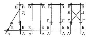 б) материалы опор: Б - железобетон, Д - дерево; для металлических опор буквенное обозначение материала не приводится; в) напряжение, кВ: 35, 110 и т.д. Указанные буквы и цифры составляют первую часть шифра, после которого через дефис пишется порядковый номер опоры (по унификации, по каталогу); одноцепные опоры обозначаются нечетными цифрами, а двухцепные - четными. Например, П110-6 - промежуточная стальная двухцепная опора для BЛ напряжением 110 кВ; УБ35-3 - анкерно-угловая железобетонная одноцепная опора для ВЛ напряжением 35 кВ; ПД110-5 - промежуточная деревянная одноцепная опора. Опоры, предназначенные для применения в специальных условиях, шифруются как нормальные с добавлением буквы С к первой части шифра, например, ПС 110-9. Стойки железобетонных опор шифруются буквой С с добавлением цифры, обозначающей порядковый номер. Для вибрированных стоек после буквы С добавляется буква В. Варианты армирования обозначаются буквами, проставляемыми после порядкового номера стойки: П - проволочное; ПР - прядевое. Шифровка стоек железобетонных опор с единицей через дефис (СК-1-1, СК-2-1) обозначает, что для их армирования применено стержневое армирование сталью класса A-V. Шифры элементов деревянных опор состоят из двух частей. Первая часть шифра обозначает назначение детали: 1 - стойка, 2 - приставка, 3 - траверса и т.д.; во второй части проставляется порядковый номер, принимаемый сквозным (начиная с 1) для каждого вида деталей. 3.8. Железобетонные опоры ВЛ переменного тока (см. рис. П8.1) имеют следующие основные детали: ствол или стойка опоры, траверсы (металлические или железобетонные), ригели и поддоны (подпятники), тросостойки, фундамент (железобетонные подножники, сваи). Железобетонные опоры ВЛ изготавливаются центрифугированными или вибрированными с предварительно напряженной и ненапряженной стержневой, проволочной, прядевой, стеклопластиковой арматурой. Схемы типовых железобетонных опор приведены на рис. П8.2. Характеристики железобетонных опор и стоек приведены в табл. П8.1 и П8.2. 3.9. Металлические опоры ВЛ переменного тока (см. рис. П8.3) имеют следующие детали: стойка или ствол опоры (пояса, решетки, диафрагмы, косынки и накладки), траверсы (пояса, решетки, тяги и косынки), тросостойки или тросовые траверсы (пояса, решетки), оттяжки, узлы крепления изолирующих подвесок. Металлические опоры и их детали изготовляются из стали, сплавов легких металлов (алюминия). Стальные опоры защищаются от коррозии горячей оцинковкой или горячей оцинковкой с дополнительной покраской, покраской лакокрасочными материалами. Схемы типовых металлических стальных опор приведены на рис. П8.4 - П8.6, а их характеристики - в табл. П8.3. 3.10. Деревянные опоры ВЛ переменного тока (см. рис. П8.7) имеют следующие основные детали: стойки, приставки (пасынки), сваи, траверсы, раскосы (ветровые связи), распорки, подкосы, ригели, подтраверсные брусья. Деревянные детали опор изготавливаются из сосны и лиственницы. Для деталей опор ВЛ 35 кВ, кроме траверс и приставок, допускается применение ели и пихты. Применяемые для опор бревна должны быть пропитаны антисептиком. Допускаются к применению непропитанные бревна из воздушно-сухой лиственницы влажностью не более 25 %. Детали опор могут выполняться как из круглого, так и из пиленого леса. Характеристики деревянных опор приведены в табл. П8.4, а объем бревен, применя