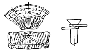 По кривой II находим: для dэ = 18 см Wэ = 580 см3; для dc = 14 см Wс = 280 см3. Для определения эквивалентного диаметра do сечения в форме кольца с ядром необходимо найти его момент сопротивления. Он принимается приближенно равным сумме Wэ и Wс т.е. 860 см3. По той же кривой II для Wo = 860 см3 находим соответствующий диаметр d0 = 20,5 см, который оказывается больше минимально допустимого. Таким образом, приставка замене не подлежит. Пример 3. Приставка с наружным диаметром в опасном сечении D = 22 см имеет в этом сечении внутреннее загнивание, как показано на рис. П7.3, в. Оно приравнивается к кольцевому внутреннему загниванию. Минимально допустимый диаметр 16 см. Результаты измерений: первого - 2/5; второго - 3/7; третьего - загнивание не обнаружено. Третьим измерением загнивание не обнаружено и не определена в то же время толщина наружного здорового слоя древесины в этом месте. В этом случае среднюю толщину наружного здорового слоя дср определяем по двум измерениям, а среднюю толщину гнилого слоя вср, которую условно считаем распределенной по окружности, - по трем измерениям. Таким образом,