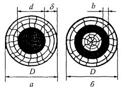 Если количество неисправных изоляторов менее указанного, то они должны заменяться в сроки, устанавливаемые главным инженером предприятия, но не позднее очередного капитального ремонта. *) Решение Главэлектросети Минэнерго СССР от 23.01.1991 г. № ЭС-1/91 «О сроках замены неисправных изоляторов ВЛ 750 кВ». Приложение 7МЕТОД РАСЧЕТА МЕХАНИЧЕСКОЙ ПРОЧНОСТИ ДРЕВЕСИНЫ ОПОР ВЛ ПРИ ВНУТРЕННЕМ ЗАГНИВАНИИПри отбраковке на ВЛ древесины с внутренним загниванием следует пользоваться методом, предложенным инженером Мосэнерго В.В. Шелеховым. Сущность метода заключается в следующем: 1. Условно принимают, что при любой форме внутреннего загнивания древесины здоровая часть ее представляет в сечении либо круговое кольцо с ядром в центре (при полном внутреннем загнивании - рис. П7.1, а), либо круговое кольцо с ядром в центре (при неполном внутреннем загнивании - рис. П7.1, б). 2. Путем измерений (двух для траверсы и трех для прочих деталей) определяют среднюю толщину наружного здорового слоя древесины (при неполном внутреннем загнивании) и диаметр здоровой сердцевины (ядра), а также среднюю толщину гнилого слоя древесины. 3. Выявленная измерениями здоровая часть детали с внутренним загниванием, имеющая момент сопротивления на изгиб W, приравнивается к равнопрочной детали, имеющей круглое сечение с вполне здоровой древесиной (равнопрочное сечение). 4. Отбраковка, так же как и при наружном загнивании, производится на основе сравнения диаметра равнопрочного сечения (эквивалентный диаметр dэ для кольца и do для кольца с ядром) с минимально допустимым диаметром для данной детали. Нормы отбраковки те же, что и при наружном загнивании (см. разд. 4). 5. Значения указанных выше величин W, dэ do для каждого определенного случая находятся по кривым рис. П7.2, построенным по приводимым ниже формулам: Рис. П7.1. Условное сечение детали деревянной опоры: а - при полном внутреннем загнивании; б - при неполном внутреннем загнивании