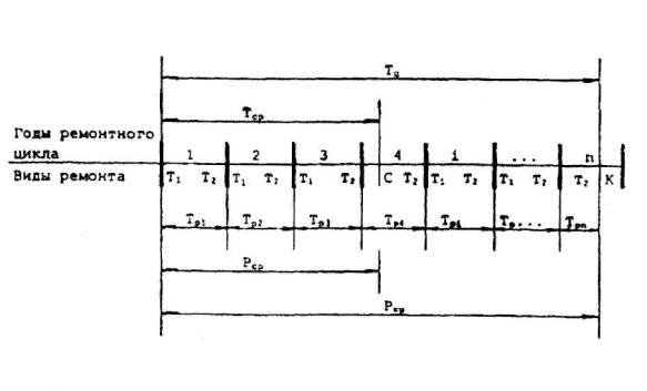 4.5. Календарная продолжительность периода от начала ремонтного цикла до начала среднего ремонта определяется аналогично вышеприведенному с использованием формул (4), (5) и (6) и с использованием показателей, соответствующих среднему ремонту. 4.6. Необходимость периодического проведения расчетов продолжительности ремонтного цикла определяется возможными изменениями годовых наработок энергоблока, что может существенно изменить сроки вывода энергоблока в очередные средний и капитальный ремонты. 4.7. На основании выполненных расчетов осуществляется корректировка перспективных и годовых графиков ремонта и модернизации энергоблоков. 4.8. Примеры расчета календарной продолжительности ремонтного цикла приведены в приложении 3. 5. ФОРМИРОВАНИЕ ПАРАМЕТРОВ РЕМОНТНОГО ЦИКЛА5.1. Структура ремонтного цикла приведена на рисунке 1 РД. Параметры ремонтного цикла следующие: 1) назначенный межремонтный ресурс между капитальными ремонтами; 2) назначенный межремонтный ресурс между капитальным ремонтом и средним ремонтом; 3) календарная продолжительность ремонтного цикла; 4) календарная продолжительность между капитальным ремонтом и средним ремонтом; 5) количество текущих ремонтов; 6) продолжительность текущих, среднего и капитального ремонтов. 5.2. Назначенный межремонтный ресурс между капитальными ремонтами является основной характеристикой ремонтного цикла и рассчитывается с учетом требований раздела 3 РД. Расчет выполняется для каждого энергоблока или для группы однотипных энергоблоков электростанции с одинаковыми условиями эксплуатации и принимается в качестве нормативного значения. Этот норматив должен быть утвержден энергообъединением, в которое входит электростанция. 5.3. Норматив назначенного межремонтного ресурса между капитальным и средним ремонтами равен половине назначенного межремонтного ресурса между капитальными ремонтами. 5.4. Календарная продолжительность ремонтного цикла рассчитывается с учетом требований раздела 4 РД. Учитывая существующую в настоящее время тенденцию к изменению ежегодных наработок энергоблоков, уточнение календарной продолжительности ремонтного цикла должно производиться ежегодно. На основе полученных величин производится корректировка перспективных и годовых графиков ремонта и модернизации энергоблоков. 5.5. Календарная продолжительность между капитальным и средним ремонтами определяется аналогично изложенному в п.5.4 РД. 5.6. Определенные в соответствии с пунктами 5.4 и 5.5 РД сроки останова энергоблока в капитальный или средний ремонты являются расчетными. Конкретные сроки вывода энергоблока в ремонт уточняются при согласовании годового графика капитальных и средних ремонтов и диспетчерских заявок на вывод в ремонт энергоблоков. 5.7. В структуре ремонтного цикла предусматривается ежегодное проведение текущих ремонтов категорий T1 и Т2, кроме годов проведения среднего и капитального ремонтов, когда текущий ремонт категории Т1 не производится. 5.8. Продолжительность текущих ремонтов категорий T1 и Т2, среднего и капитального ремонтов принимается по действующим нормативам ППР и "Правилам организации технического обслуживания и ремонта оборудования, зданий и сооружений электростанций и сетей" РДПр 34-38-030-92 или другим нормативам, введенным в действие в установленном порядке. 6. ТЕХНИЧЕ