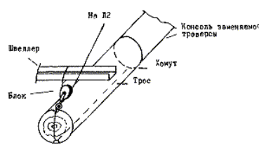 лебедкой). Тяговый трос (7) с его лебедки перебрасывается через траверсу и